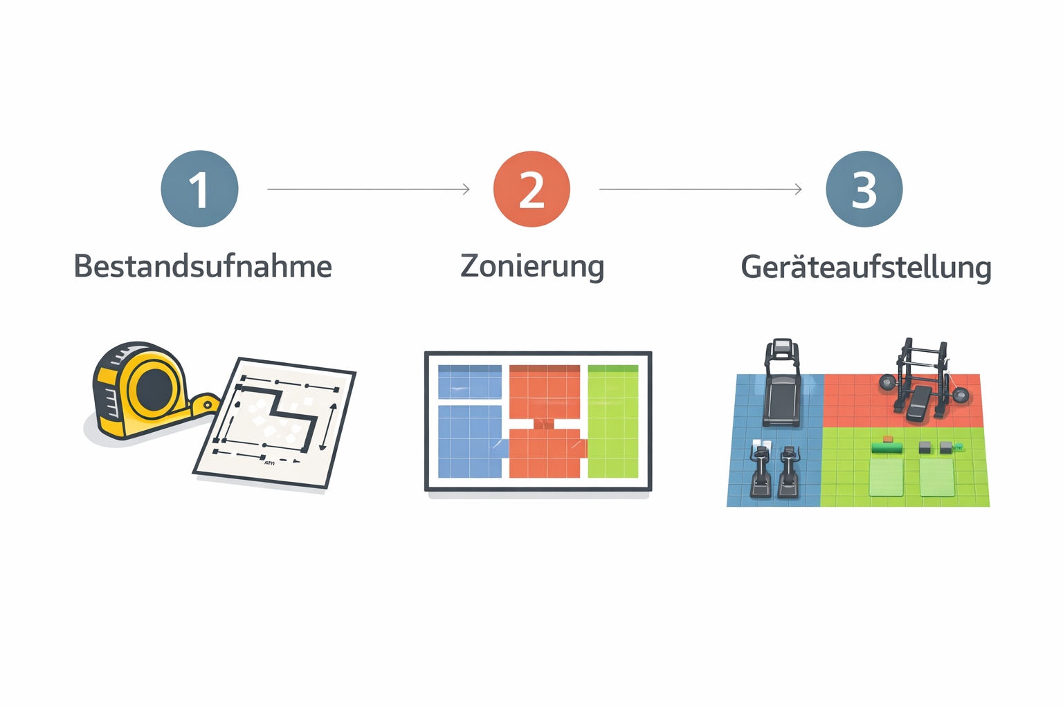 Gehen Sie bei der Grundrisserstellung in drei Schritten vor: Erfassen Sie zunächst die Raummaße und tragen Sie alle baulichen Gegebenheiten ein. Legen Sie dann das Zonenkonzept fest – positionieren Sie Cardio-Bereich, Krafttrainings-Bereich und Stretching-Zone entsprechend der beschriebenen Planungsregeln. Im dritten Schritt folgt die detaillierte Geräteaufstellung mit Sicherheitsabständen und Verkehrsflächen.
