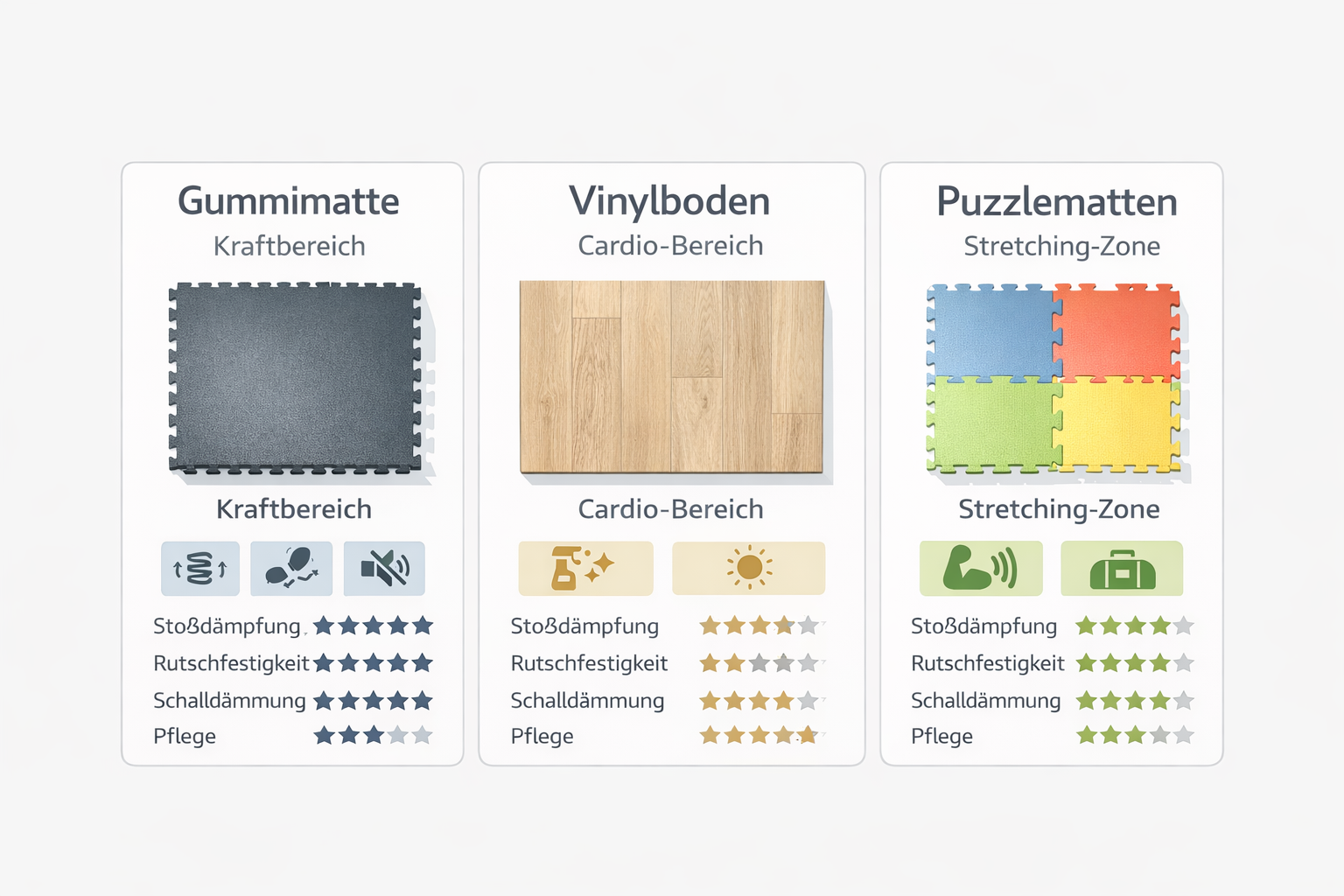 Der richtige Bodenbelag ist eine der wichtigsten Entscheidungen beim Fitnessstudio-Grundriss. Er muss Stöße absorbieren, rutschfest sein und zugleich die Schalldämmung unterstützen. Eine Gummimatte bietet Stoßdämpfung, Rutschfestigkeit und Schallschutz in einem – deshalb ist sie im Kraft- und Freihantelbereich die erste Wahl.
