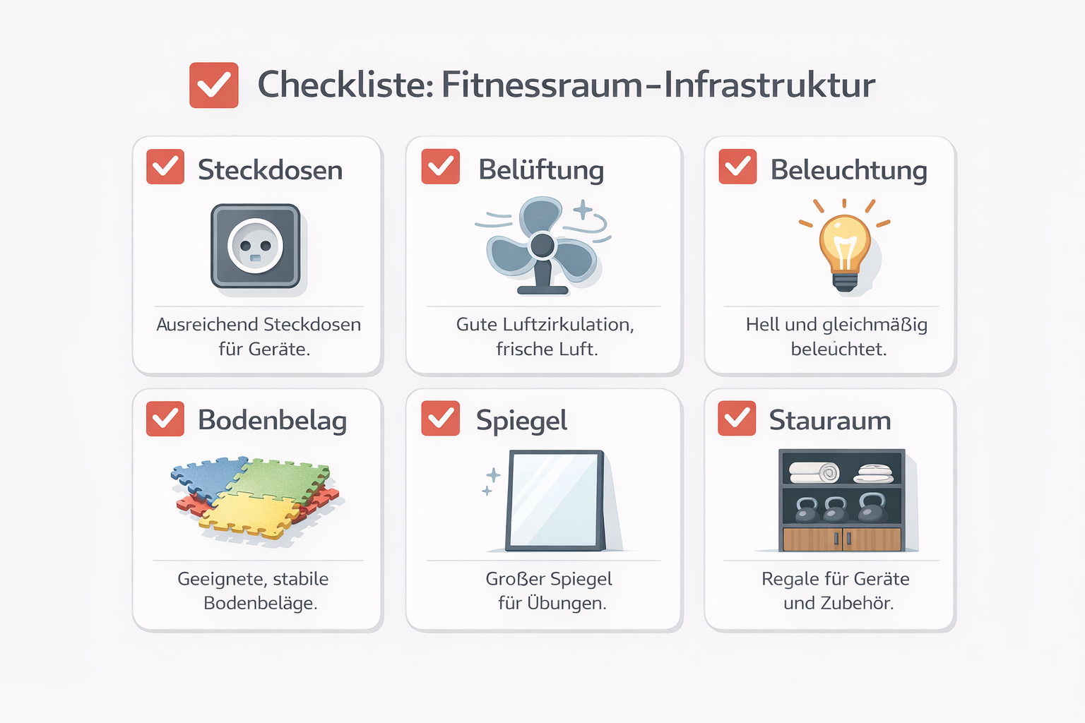 Die Raumhöhe muss mindestens 2,40 m betragen, insbesondere für Klimmzugstange und Sprungtraining. Bei niedrigeren Decken schränken Sie nicht nur die Übungsauswahl ein, sondern riskieren auch Verletzungen. Messen Sie vor der Planung die lichte Höhe an mehreren Stellen, da Rohre, Unterzüge oder Dachschrägen die nutzbare Raumhöhe reduzieren können.